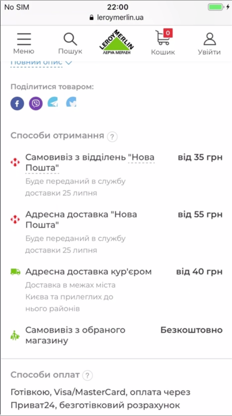 So, for example, here https://www.leroymerlin.ua/ru/p/Kukhnia_BETON_PRYaMAYa_S_YaShchIKAMI_24m.11960172 for NP and pick-up we need to put next info