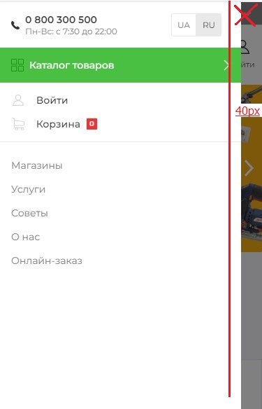15) Когда нажимаю на корзину, модальное окно пропадает только по клику на иконку. На затемненную зону тоже должно16) Убрать скролл-бар в левом меню17) Элементы навигации меньше на мобильном. 22-23px линия, стрелку с макета можно забрать. Белого цвета. Опусти линии немного ниже